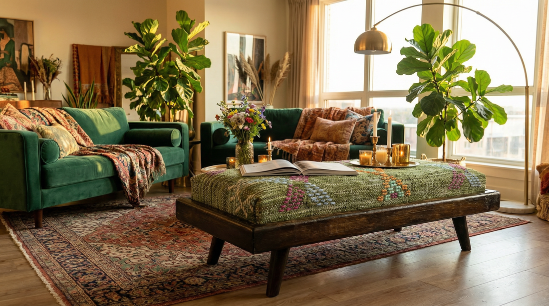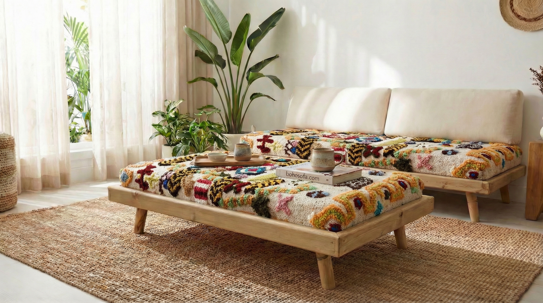 Handcrafted Moroccan Modular Bench & Coffee Table β boho Geometric Kilim Fabric on Rustic Natural Wood Base