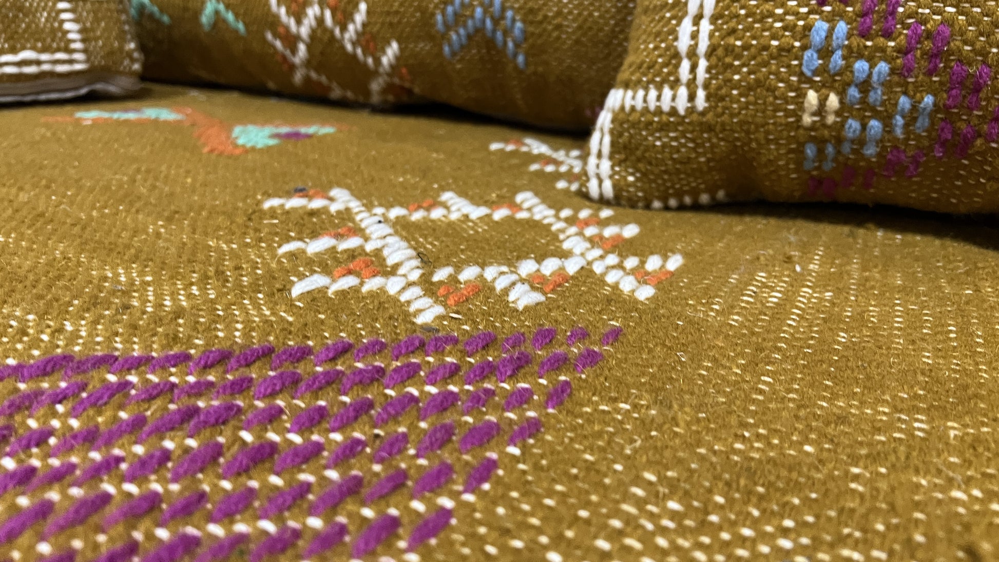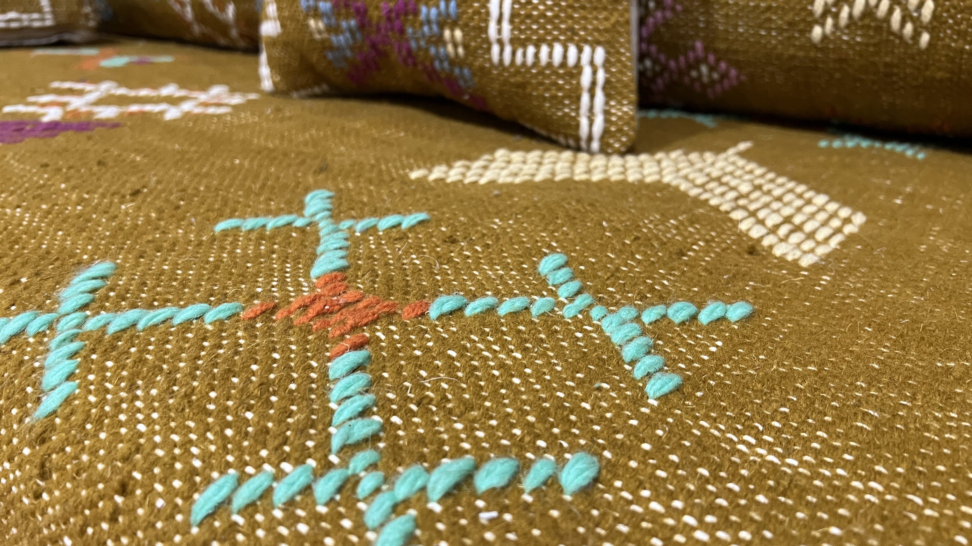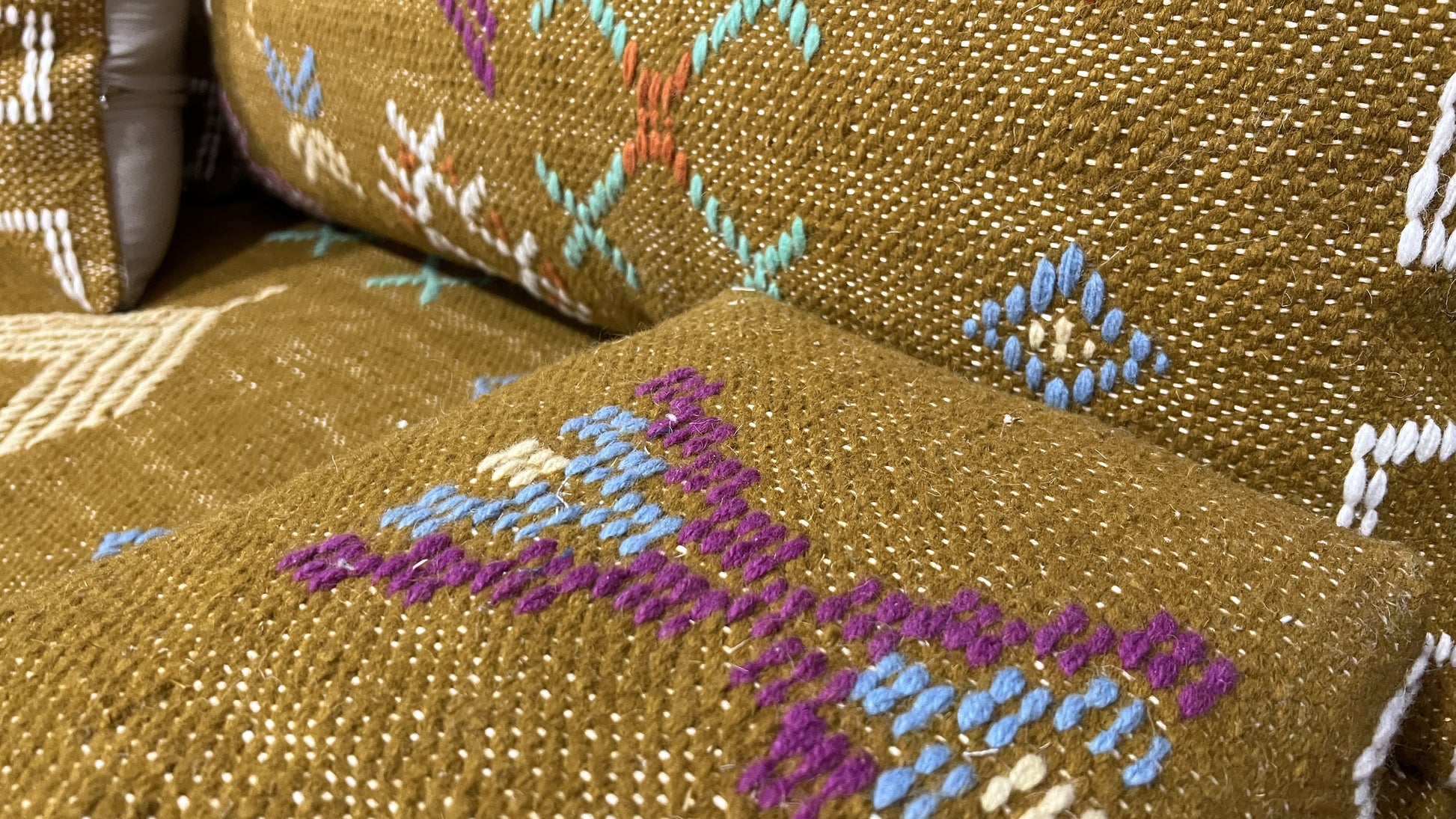 This complete floor couch set represents fair trade craftsmanship, directly supporting Moroccan artisan communities. Each purchase helps preserve ancient weaving traditions while providing sustainable income to skilled craftspeople. The natural wool is ethically sourced and processed using traditional, eco-friendly methods.