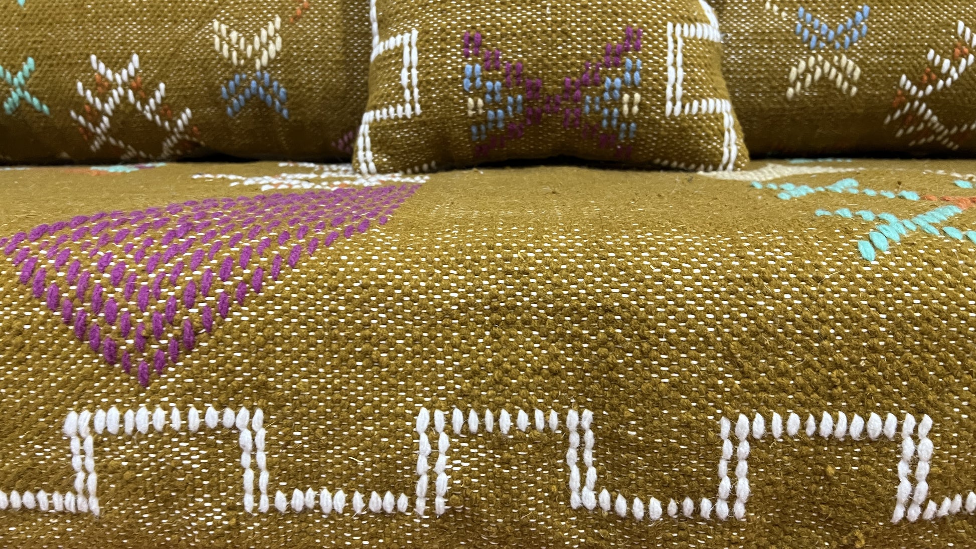 Authentic Moroccan Handmade Wool Floor Couch - Olive-Yellow Geometric Design